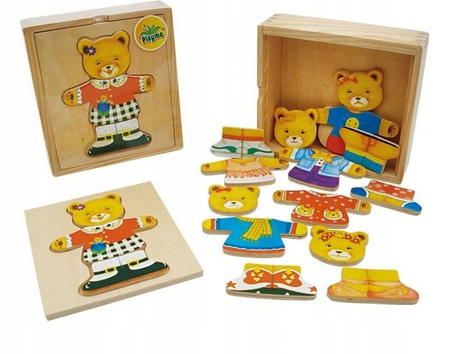 - Zestaw 18 drewnianych elementów (części ciała i garderoby misia), które Twoje Dziecko będzie dopasowywać (jeden do drugiego) kształtem i kolorem.